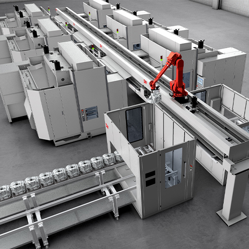 Each SW machining center is a highly productive solution with the shortest cycle times. In production lines, it is important to further increase productivity by optimizing material flow and sophisticated automation into efficient complete processing from the raw part to the finished component. Conventional robots with six axes reach their limits here. Our solution is linking the machine tools and other stations via SW’s “TopRob7” 7-axis robot gantry.